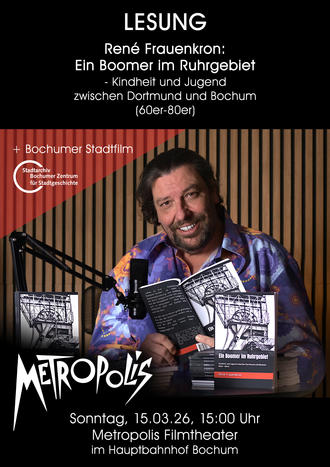 Am Sonntag, den 15.03. um 15:00 Uhr begrüßen wir im METROPOLIS den Unternehmer René Frauenkron, der aus seinem Buch "Ein Boomer im Ruhrgebiet - Kindheit und Jugend zwischen Dortmund und Bochum (60er-80er)" liest. Zusätzlich zeigen wir einen Stadtfilm aus dem Archiv des "Bochumer Zentrum für Stadtgeschichte".